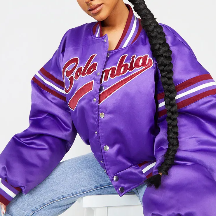 Huili Designer Satin Polyester Varsity Jacket Women Custom College Team logo Embroidery Streetwear Letterman Jacket